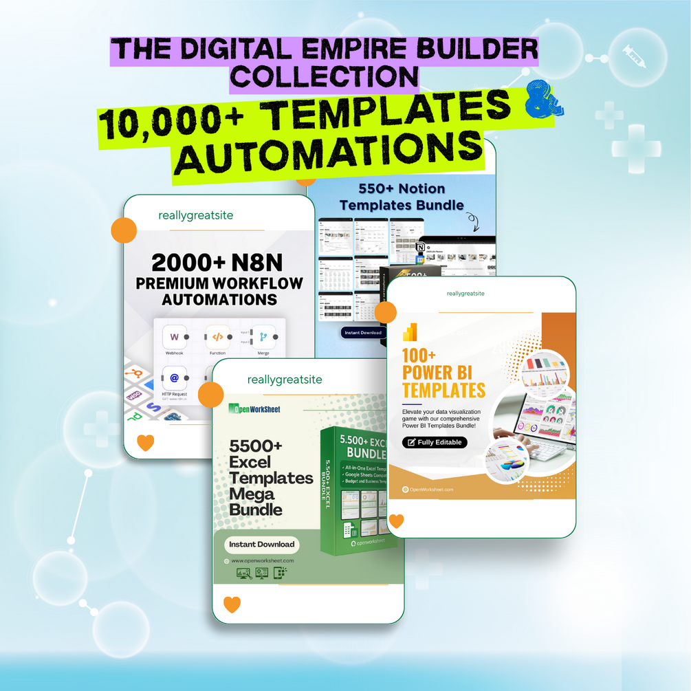 This comprehensive collection brings together four essential digital toolkits, providing you with over 10,000 ready-made templates and automations to streamline every aspect of your work and life: 550+ Ultimate Notion Templates: Your all-in-one hub for project management, personal organization, content planning, and business operations. 100+ Power BI Templates: Unlock data-driven insights with professional, pre-built dashboards for sales, marketing, finance, and operational analytics. 5500+ Excel Templates Mega Bundle: A vast library of ready-to-use spreadsheets for budgeting, financial modeling, inventory, invoicing, and diverse business needs. 2000+ n8n AI Workflow Instant No-Code Automations: Connect your favorite apps and automate repetitive tasks, building powerful workflows without a single line of code. Together, these bundles offer an unparalleled shortcut to efficiency, data mastery, and effortless automation, eliminating the need to build from scratch.